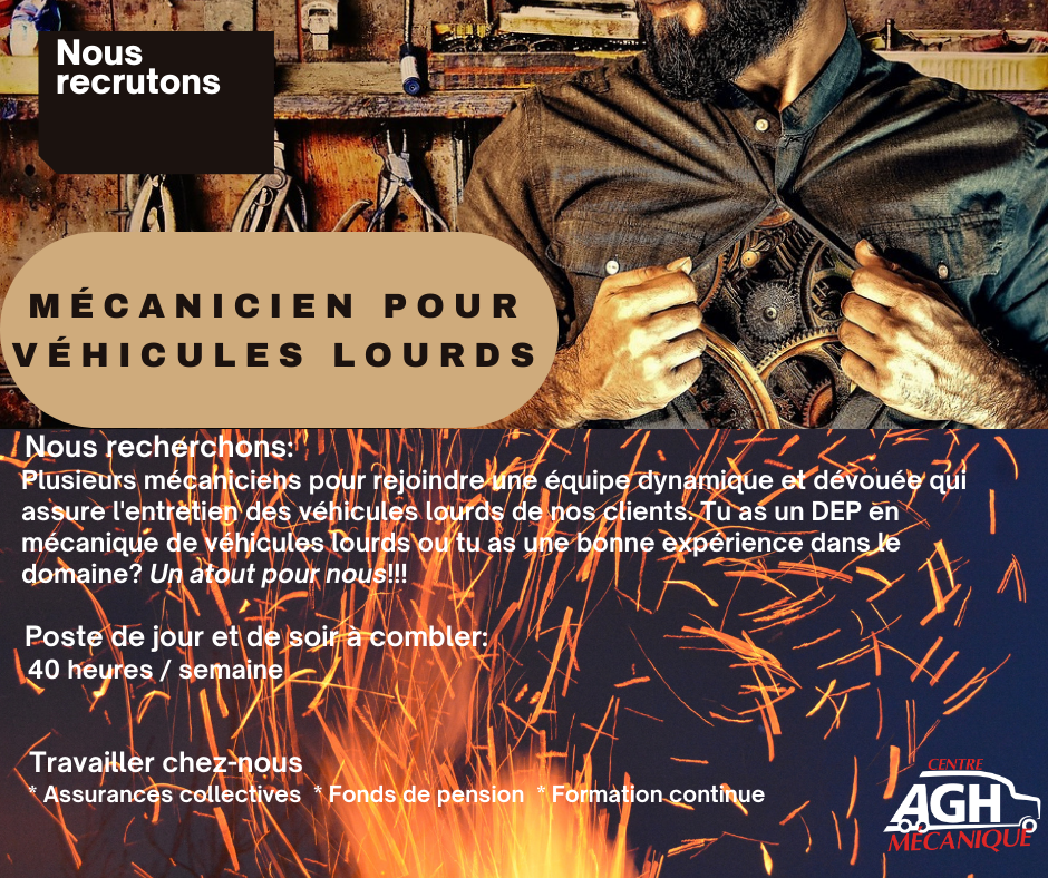Nous recherchons plusieurs mécaniciens pour rejoindre une équipe dynamique et dévouée qui assure l'entretien des véhicules lourds de nos clients. Tu as un DEP en mécanique de véhicules lourds ou tu as une bonne expérience dans le domaine? Un atout pour nous!!!